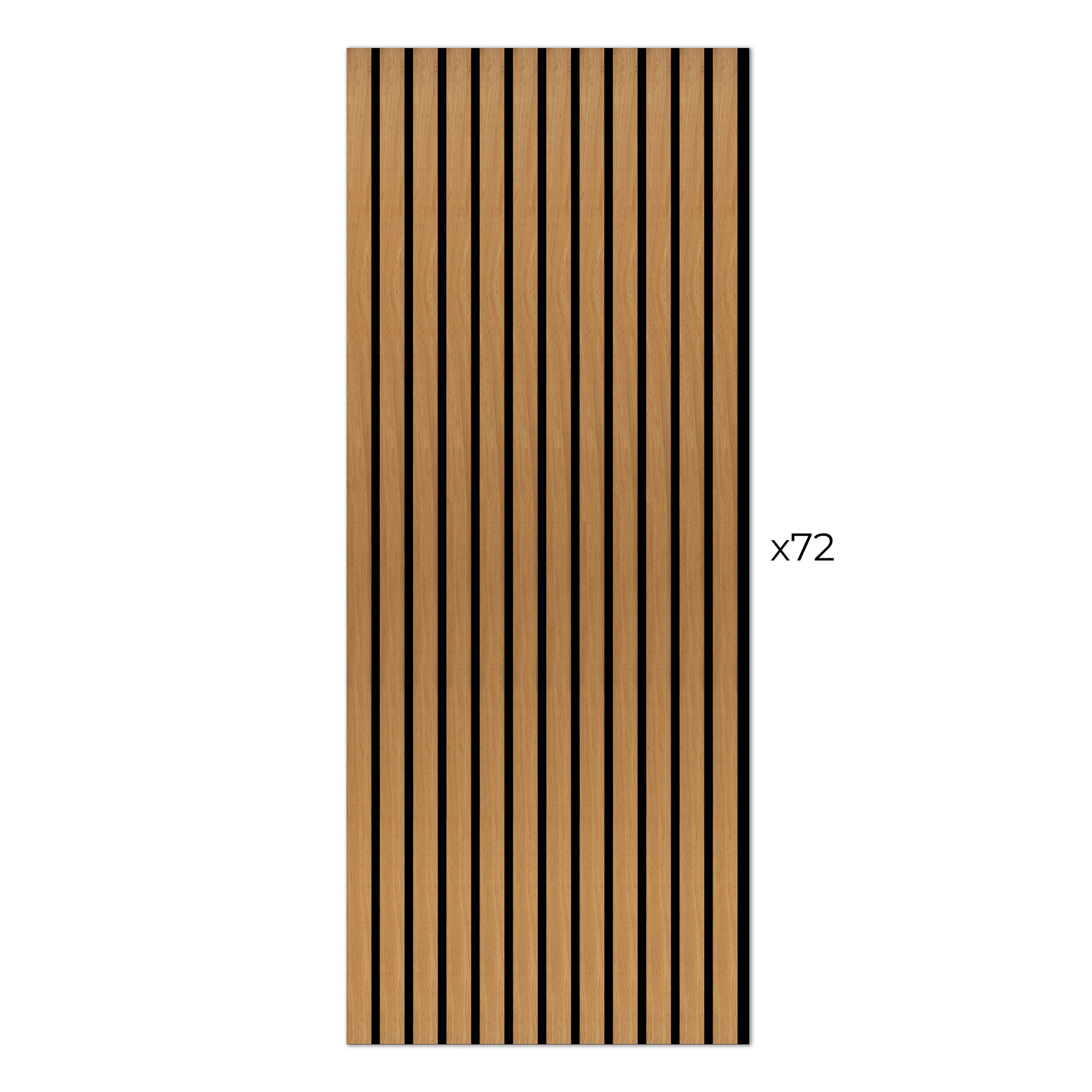 Designed with professionals in mind, the everhome 72-Pack of Acoustic Wall Panels offers a high-performance, design-forward solution for large-scale projects (442.68 sq. ft.). Whether you're outfitting an office, hospitality space, recording studio, or upscale residential development, these panels combine premium sound absorption (NRC 0.75) with refined aesthetics. Crafted from FSC-certified laminate wood, each panel features 12 wood slats. The smooth laminate texture allows for seamless installations, a key advantage over traditional wood veneer, while also making the panels easier to clean and maintain. Ideal for walls or ceilings, the panels install easily with glue or the included screws and anchors making them perfect for fast, efficient job site integration. Durable, lightweight, and low maintenance, this bulk pack delivers acoustic performance and elevated design in one smart, scalable solution for pro customers.